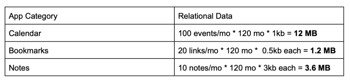 Let’s run some napkin math for a few personal app use-cases to see how much data we are talking about over a 10 year period: