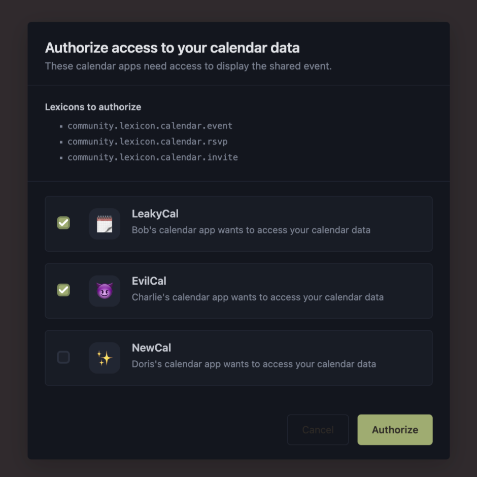 Beyond privacy, there are UX issues to consider as well. Imagine Alice, Bob, Charlie and Doris will not budge on their choice of calendar. In order for each of their calendar apps to work, all will need to authorize each others’ calendar AppViews to see their data. As more AppViews are added, the number of authorization steps needed increases exponentially. New entrants into the calendar market will face resistance as users learn to be distrustful of unrecognized providers. This outcome is at odds with ATProtocol’s mission to be open to new apps wishing to join the network.